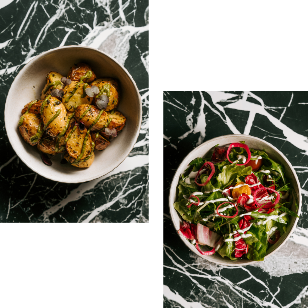 LEFT: Roasted chat potatoes, salsa verde, rosemary salt, micro radish [vg gf df nf]